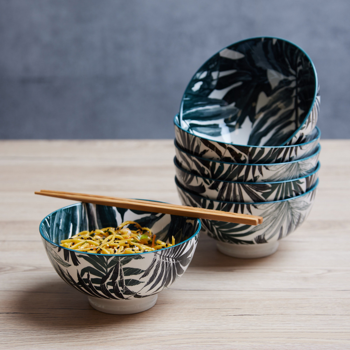 These bowls have a tropical leaf pattern in dark green, which contrasts wonderfully with the white hue that is splattered throughout.