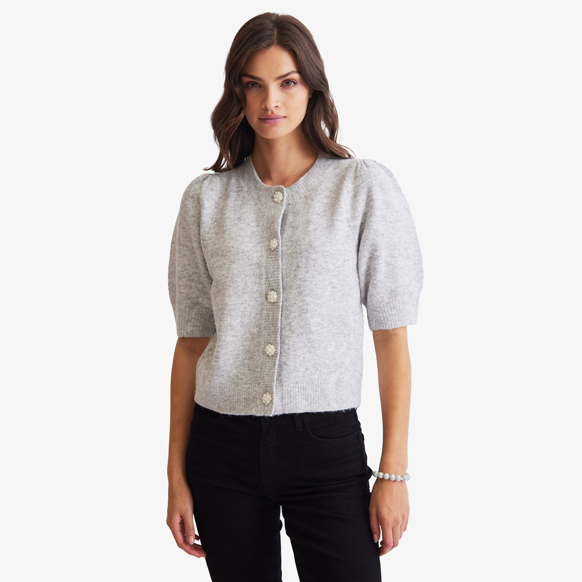 A soft, short-sleeved knitted cardigan with a round neckline and puff shoulders. It features five pearl-style buttons down the front and a ribbed hem for a flattering, fitted look.