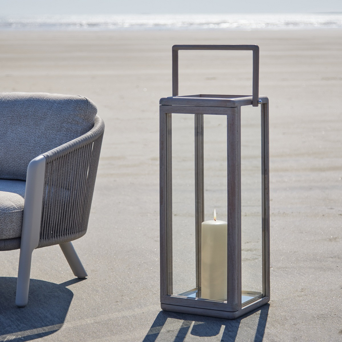 Designed to make a statement, the large Tular Teak Lantern features teak wood framing with glass panels and a top handle. Ideal for holding multiple candles, it brings warm light and natural texture to spacious interiors or covered outdoor areas.