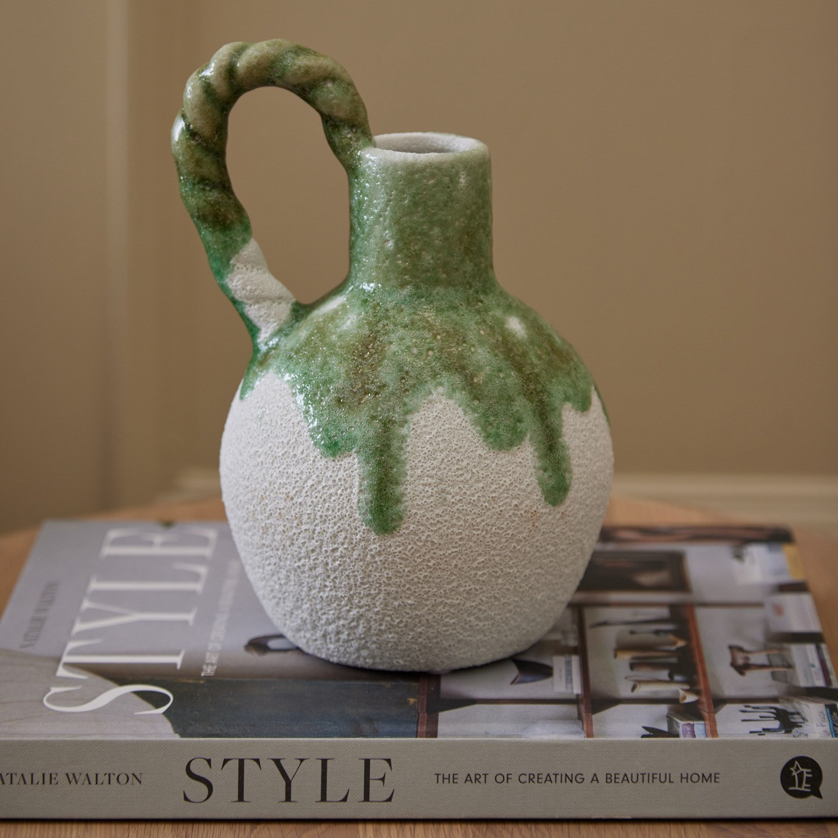 Our Verdant Bud Vase pairs a matte white base with a flowing green glaze and a twisted handle that mimics natural forms. Compact and eye-catching, it’s a subtle way to add character to your home.