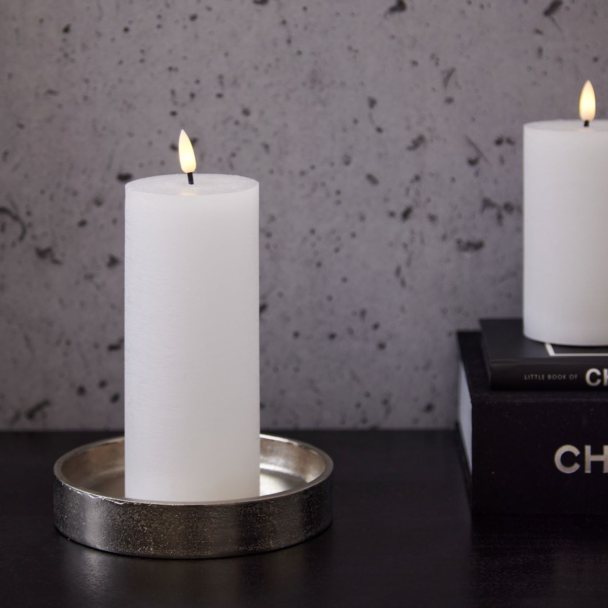 Our LED Pillar Candles are a beautiful and safe alternative to a real candle. Perfect for homes with pets and small children. The flameless glow mimics real candles with a gentle flicker. The safe and smoke-free way to add ambience to your interiors!        Each candle comes with a remote and a built in timer function.Â